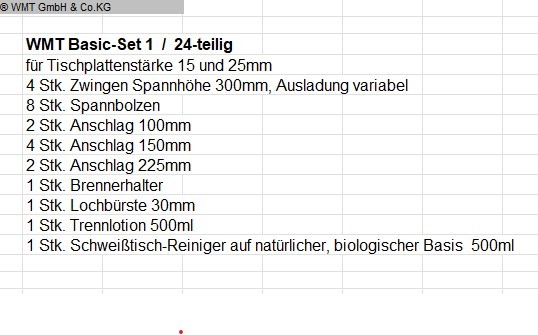 Basic-Set 1 / 24-teilig für Tischplattenstärke 15 und 25mm 4 Stk. Zwingen Spannhöhe 300mm, Ausladung variabel 8 Stk. Spannbolzen 2 Stk. Anschlag 100mm 4 Stk. Anschlag 150mm 2 Stk. Anschlag 225mm 1 Stk. Brennerhalter 1 Stk. Lochbürste 30mm 1 Stk. Trennlotion 500ml 1 Stk. Schweißtisch-Reiniger auf natürlicher, biologischer Basis 500ml